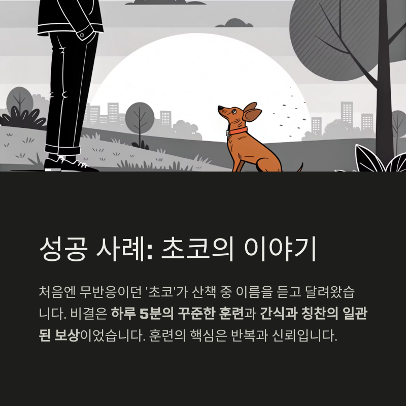 비결은 하루 5분의 꾸준한 훈련과, 항상 간식을 주며 칭찬해준 일관된 행동이었습니다.