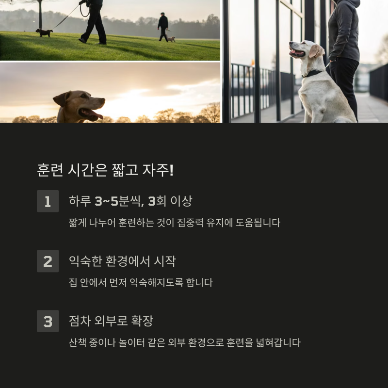 집 안에서 익숙해지면 점차 산책 중이나 놀이터처럼 외부 환경에서도 훈련을 확장합니다.