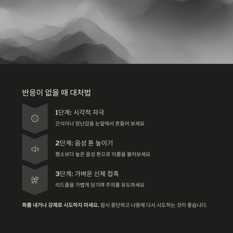 이름을 불렀는데 강아지가 반응하지 않는다면, 단계적으로 자극을 높이는 방법이 있습니다.