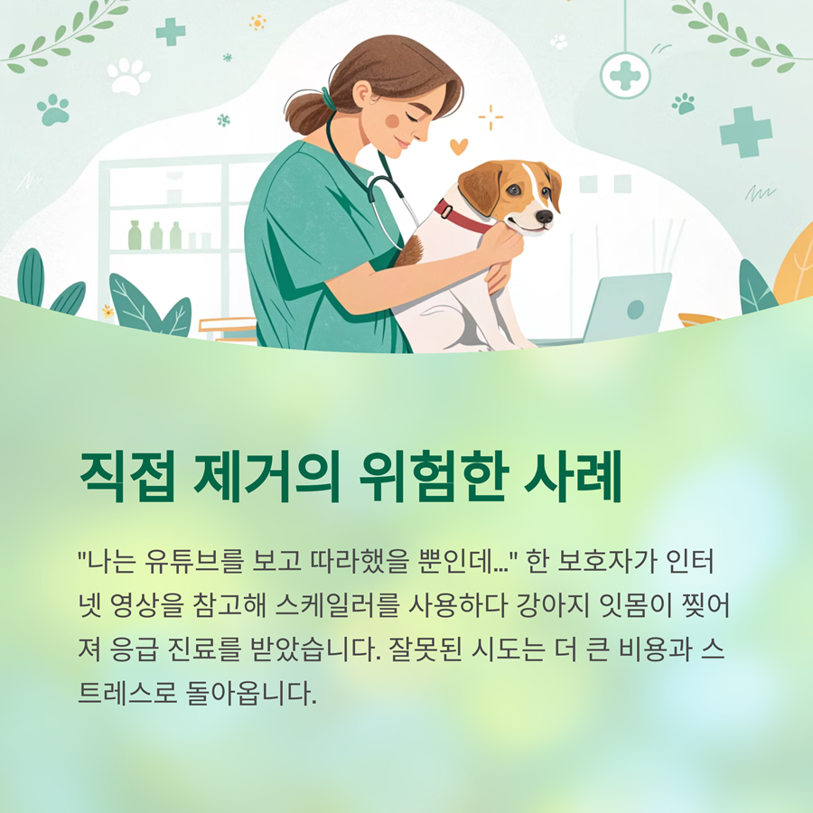 "2024년 기준, 대한수의사회와 구강전문의들은 모든 치석 제거는 반드시 전문 장비와 마취 하에 시행해야 안전하다는 입장을 명확히 밝혔습니다."