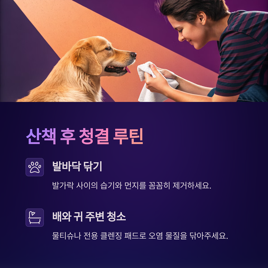 산책 후에는 발바닥, 배, 귀 주변을 물티슈나 전용 클렌징 패드로 닦아주는 것이 좋습니다.