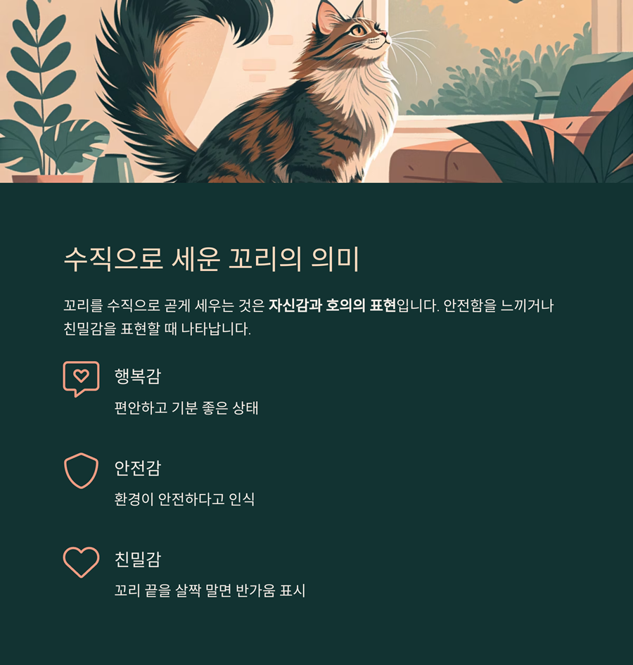 | 자신감/반가움 | 꼬리 수직 상승 | 편안하고 긍정적인 감정 |