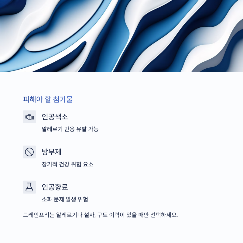 고양이의 건강을 위협할 수 있는 인공색소, 방부제, 인공향료가 들어간 제품은 피해야 합니다.