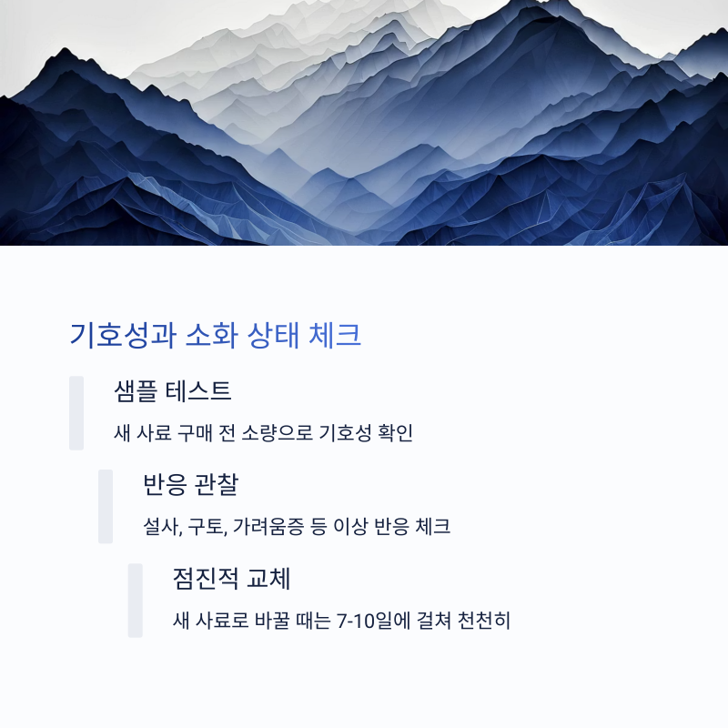따라서 기호성 테스트 샘플을 먼저 시도해보거나, 기존에 잘 먹던 재료와 비슷한 성분 조합을 선택하는 것도 하나의 방법입니다.