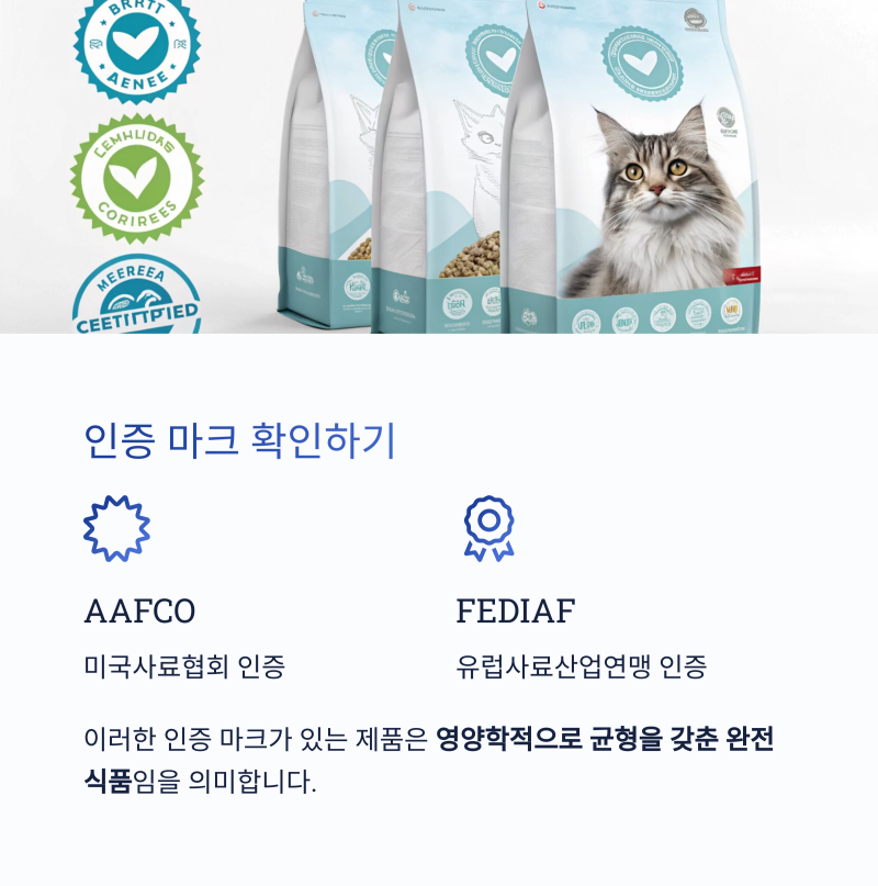 AAFCO(미국사료협회) 또는 FEDIAF(유럽사료산업연맹) 인증 마크가 있는 제품은 영양학적으로 균형을 갖춘 완전식품임을 의미하므로 신뢰도가 높습니다.