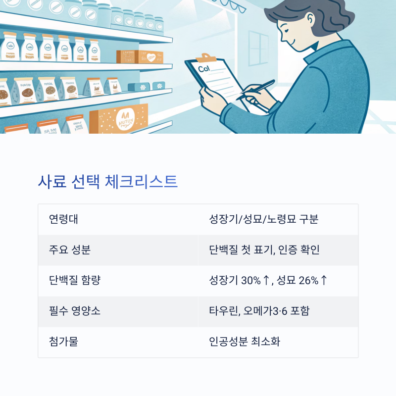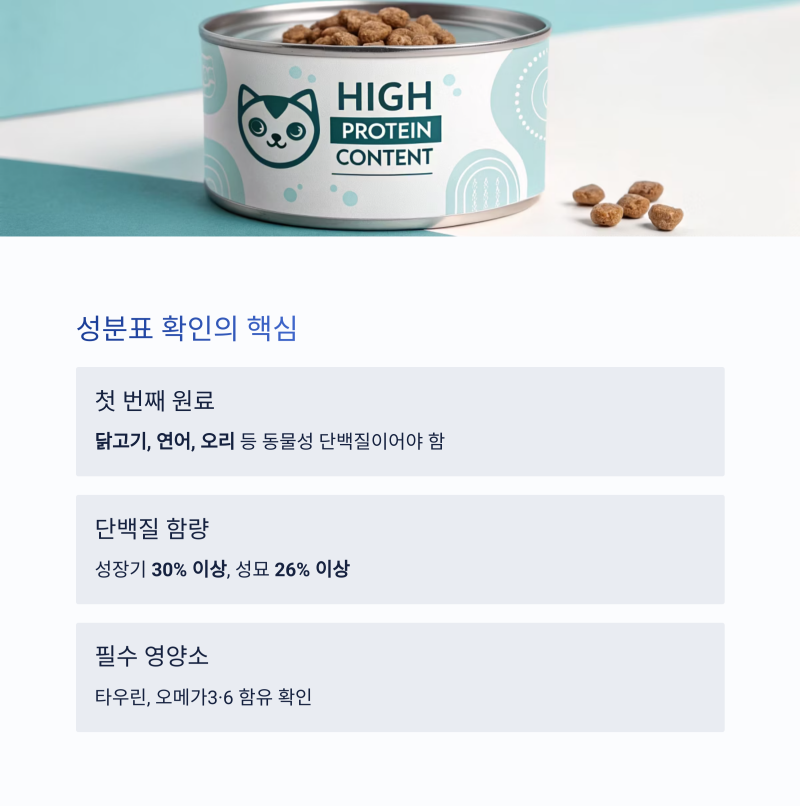 단백질 함량은 성장기용 30% 이상, 성묘용 26% 이상(AAFCO 기준)인지 반드시 확인하세요.