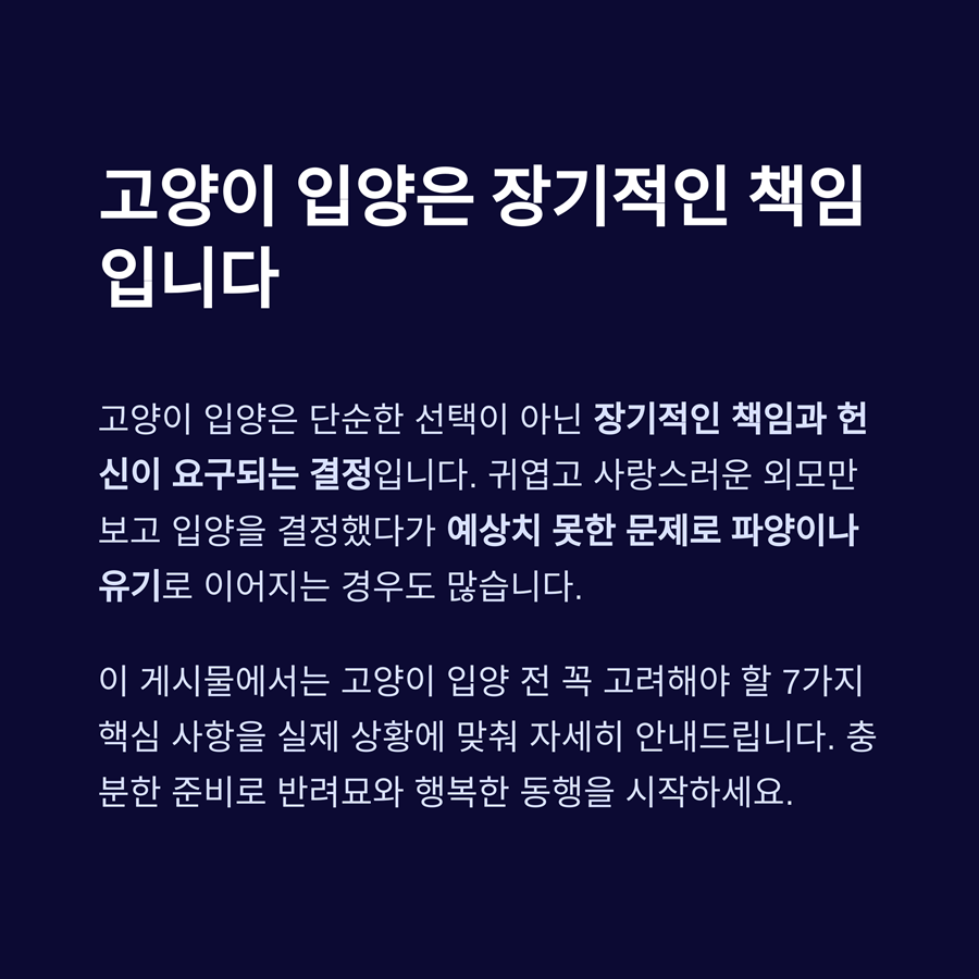 고양이 입양은 단순한 선택이 아닌 장기적인 책임과 헌신이 요구되는 결정입니다.