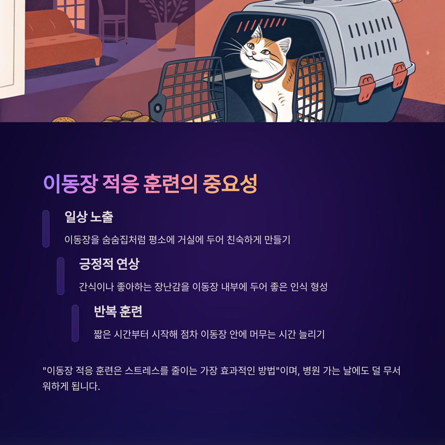 "이동장 적응 훈련은 스트레스를 줄이는 가장 효과적인 방법"이며, 반복 훈련이 핵심입니다.