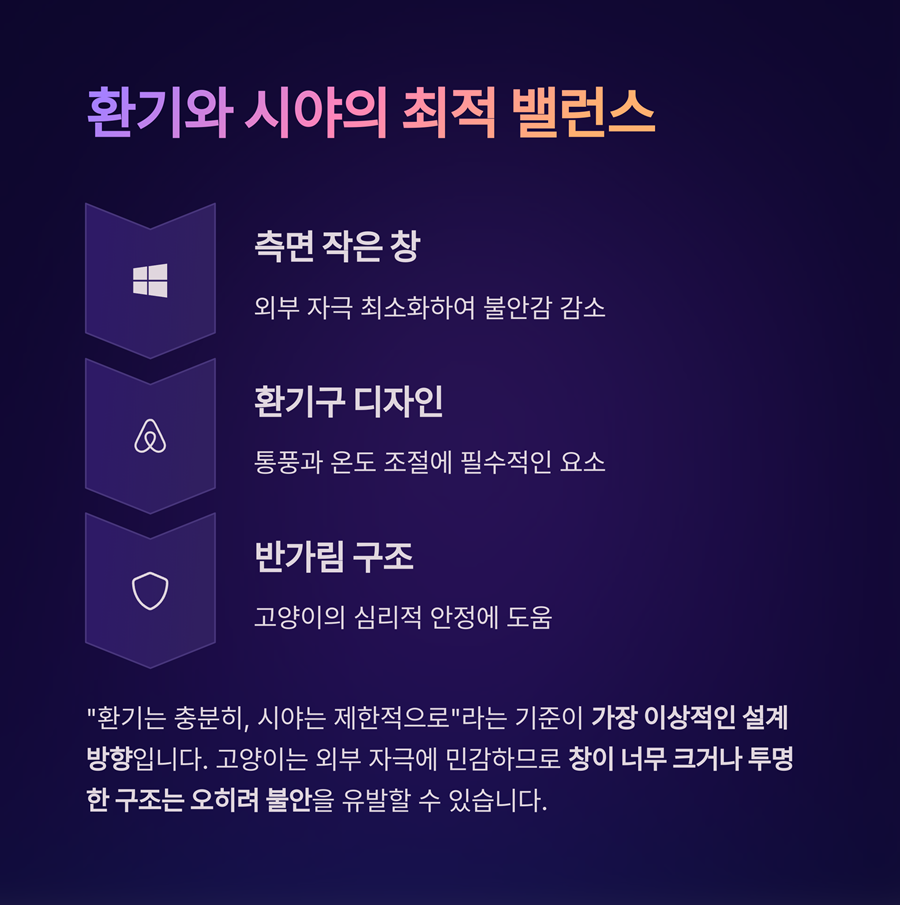 고양이는 외부 자극에 민감하므로 창이 너무 크거나 투명한 구조는 오히려 불안을 유발할 수 있습니다. 하지만 충분한 환기구는 필수입니다.