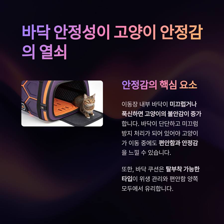 이동장 내부 바닥이 미끄럽거나 푹신하면 고양이의 불안감이 증가합니다. 바닥이 단단하고 미끄럼 방지 처리가 되어 있어야 고양이가 이동 중에도 편안함과 안정감을 느낄 수 있습니다.