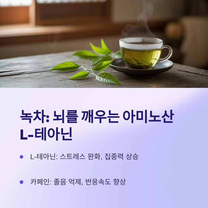 녹차에는 L-테아닌과 카페인이 함께 작용하여 집중력과 반응 속도를 개선하는 데 도움이 됩니다.