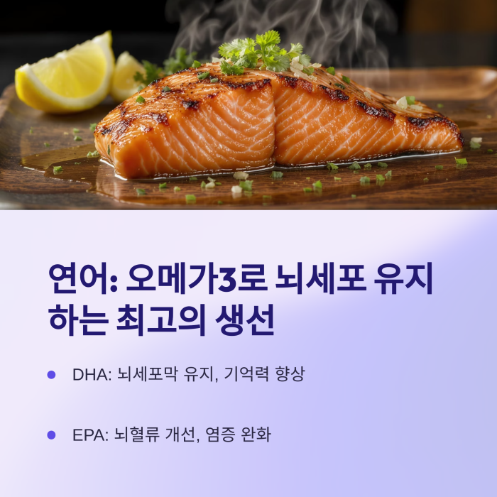 연어에는 DHA, EPA 등 오메가-3 지방산이 풍부하여 뇌세포막을 건강하게 유지시키고 신경전달 기능을 향상시켜 줍니다.