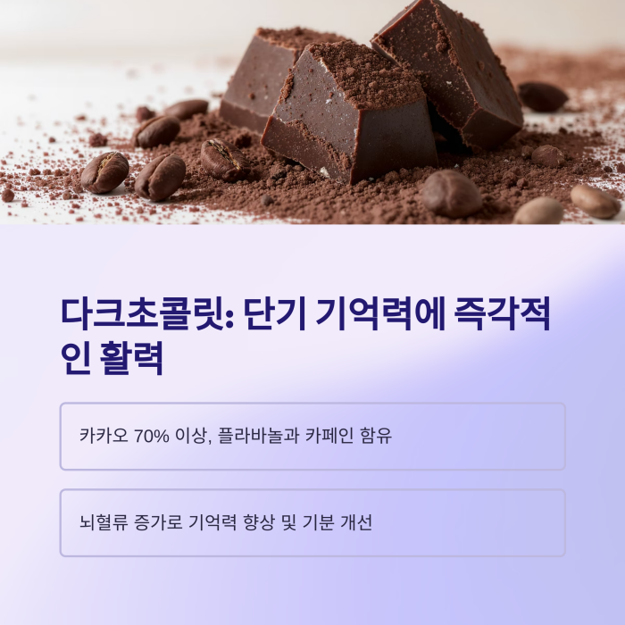 카카오 함량 70% 이상인 다크초콜릿은 플라바놀과 카페인이 뇌혈류를 증가시켜 단기 기억력을 향상시키고 기분을 개선하는 효과가 있습니다.