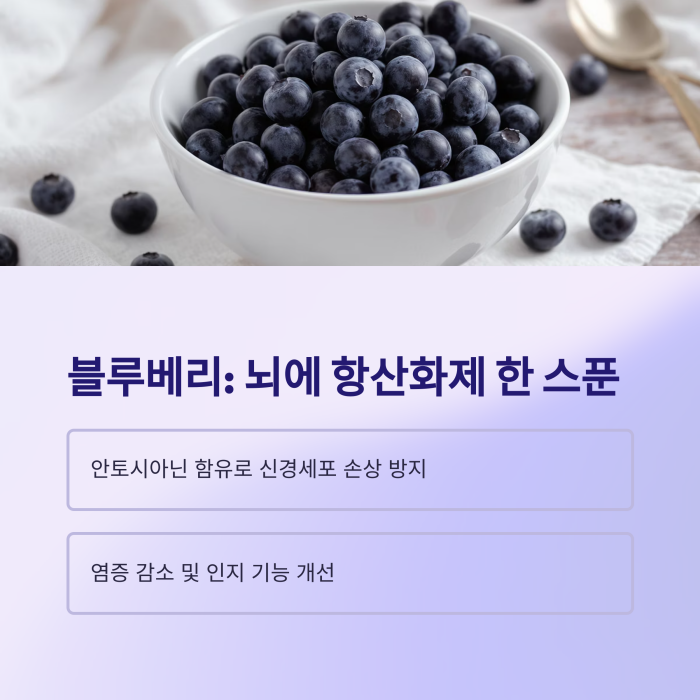 블루베리는 안토시아닌이라는 강력한 항산화 물질이 풍부해 신경세포 손상을 방지하고 뇌 기능 저하를 늦추는 데 도움이 됩니다.