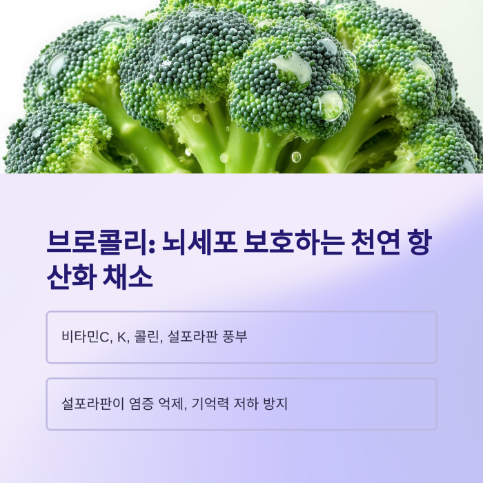브로콜리에는 비타민C, K, 콜린, 설포라판 등이 풍부하여 뇌세포 손상을 예방하고 신경 기능 유지에 기여합니다.