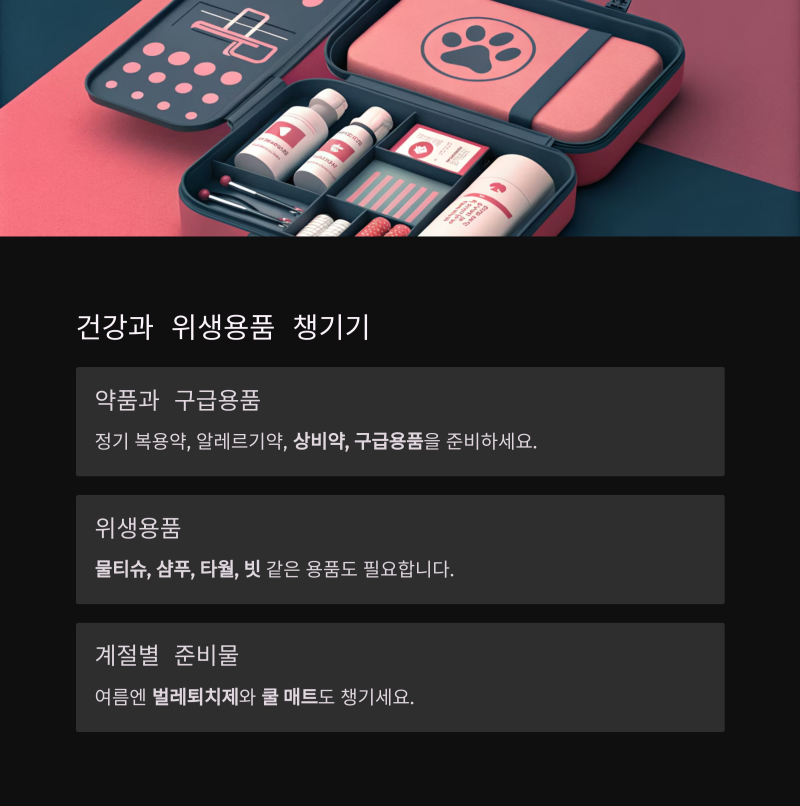 정기 복용 중인 약이나 알레르기 약은 반드시 챙기고, 진드기 퇴치제나 상비약, 구급용품도 준비해두는 것이 좋습니다.