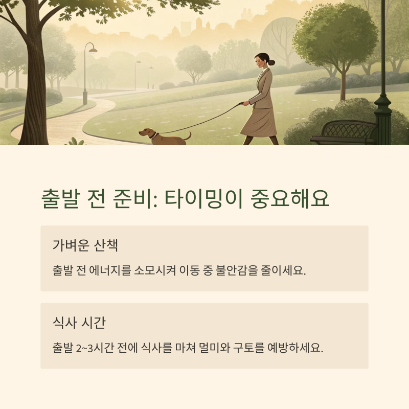 출발 전 준비: 산책과 식사 타이밍 조절