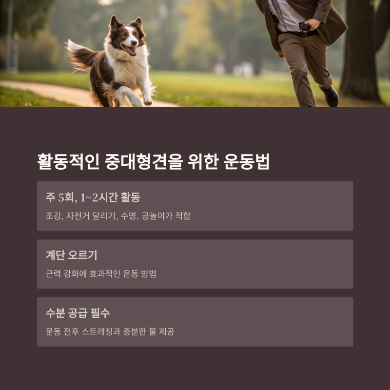 - 조깅, 자전거와 함께 달리기, 수영, 공 던지기, 프리스비 등이 적합