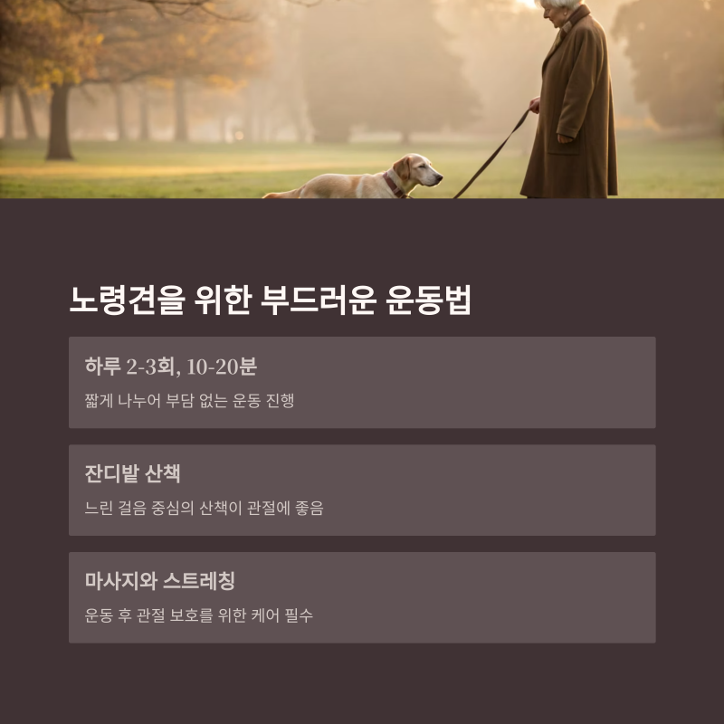 노령견은 체력과 관절 상태를 고려한 짧고 부드러운 운동이 이상적입니다.