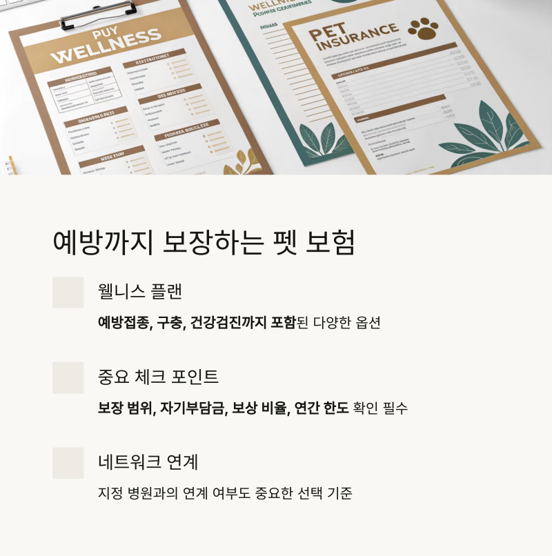 최근 펫 보험은 단순한 사고·질병 보장뿐만 아니라 **예방접종, 구충, 건강검진까지 포함된 ‘웰니스 플랜’**을 선택할 수 있어 다양성이 높아졌습니다.