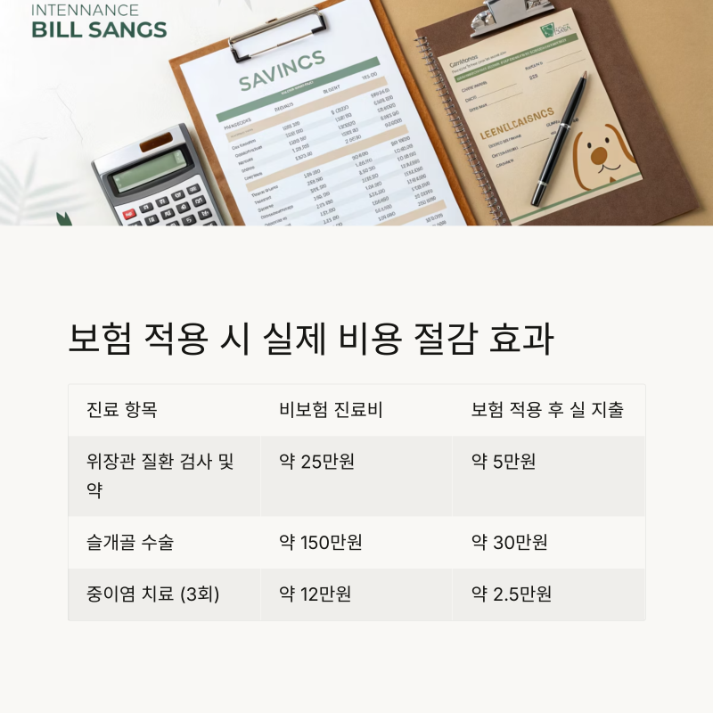| 진료 항목 | 비보험 진료비 | 보험 적용 후 실 지출 |