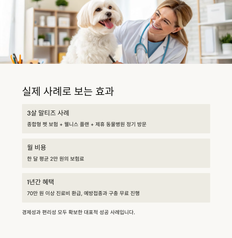 이 조합은 경제성과 실질적 보장을 모두 갖춘 구성으로, 반려동물의 건강을 체계적으로 관리하면서 보호자의 부담을 최소화할 수 있습니다.