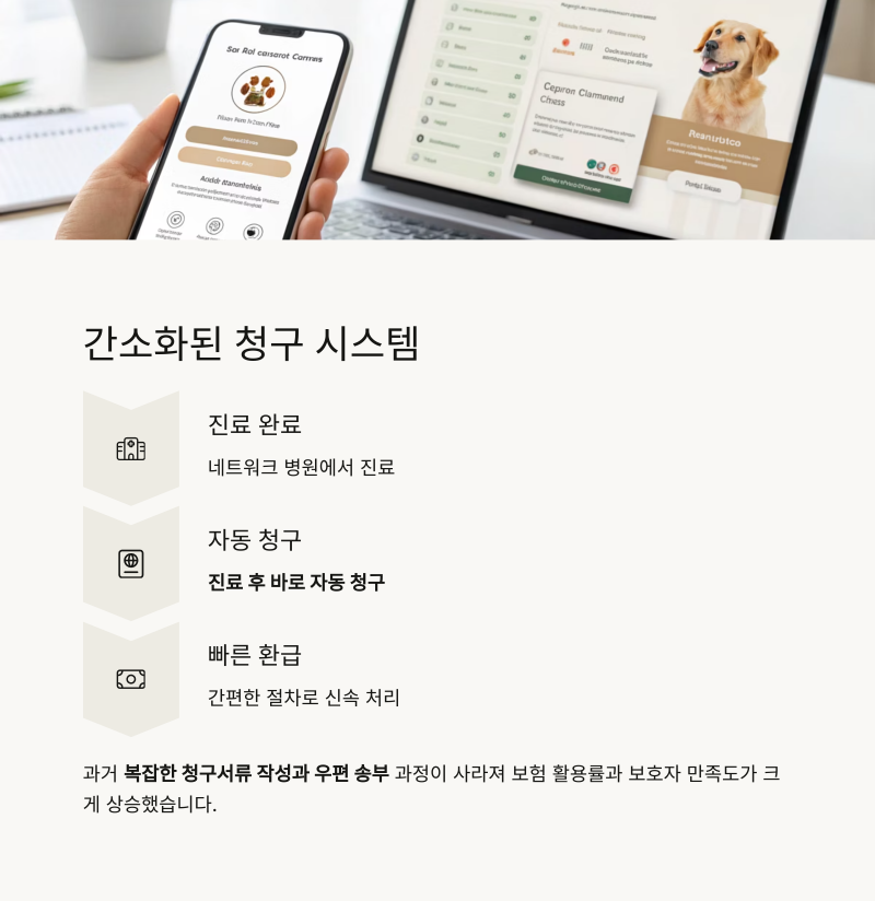 진료 후 바로 자동 청구가 이뤄집니다. 이로 인해 보험 활용률이 높아지고 보호자의 만족도 역시 상승하고 있습니다.