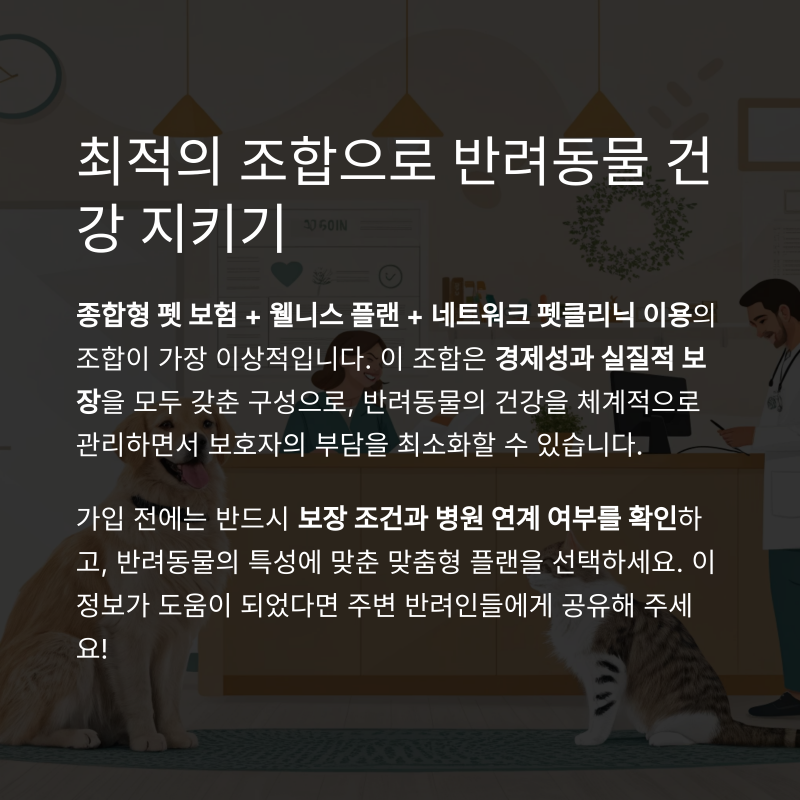 종합형 펫 보험 + 웰니스 플랜 + 네트워크 펫클리닉 이용의 조합이 가장 이상적입니다.