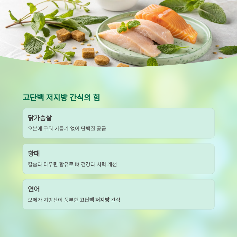 오븐에 구운 닭가슴살은 기름기 없이 단백질을 공급하며, 황태는 칼슘과 타우린까지 함께 제공해 뼈 건강과 시력에도 도움을 줍니다.