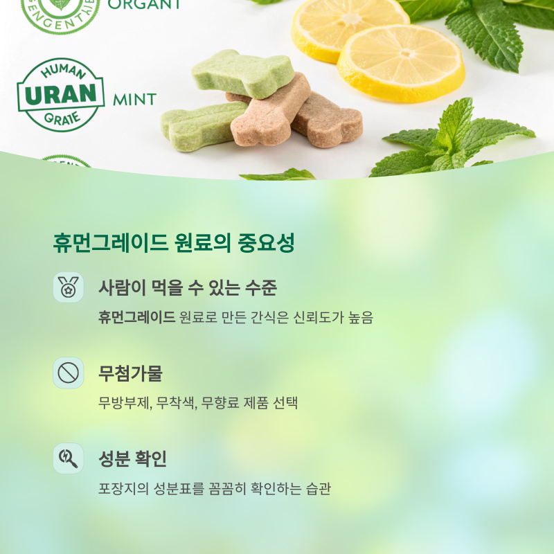 반려동물용 식품이라도 사람이 먹을 수 있는 수준의 원료(Human Grade)를 사용하면 신뢰도가 높아지고 안심하고 급여할 수 있습니다.