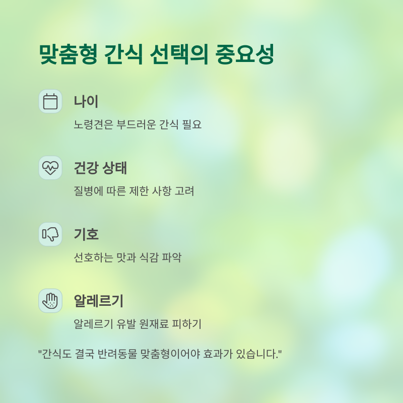 다이어트를 위한 간식을 고를 때, 반려동물의 나이, 건강 상태, 기호를 충분히 고려해야 합니다. 노령견은 치아 상태가 약해 부드러운 간식이 필요하며, 알레르기 유무에 따라 특정 원재료는 피해야 합니다.