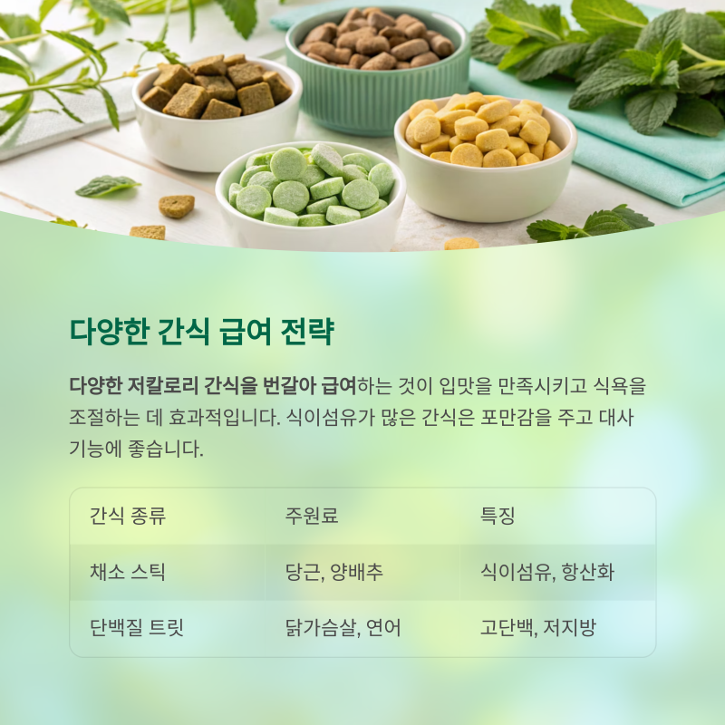 하나의 간식에 의존하기보다는 다양한 저칼로리 간식을 번갈아 급여하는 것이 입맛을 만족시키고 식욕을 조절하는 데 효과적입니다.