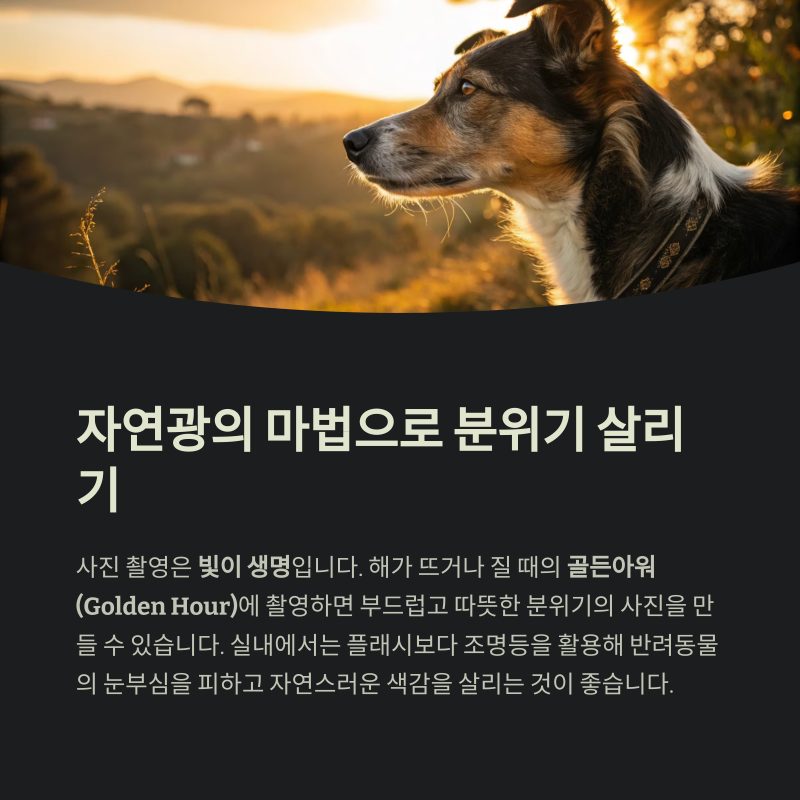 실내에서는 플래시보다 조명등을 활용해 반려동물의 눈부심을 피하고 자연스러운 색감을 살리는 것이 좋습니다.