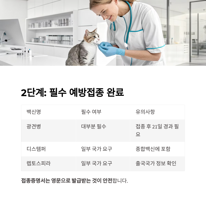 | 광견병 | 대부분 국가 필수 | 접종 후 최소 21일 경과 필요 |