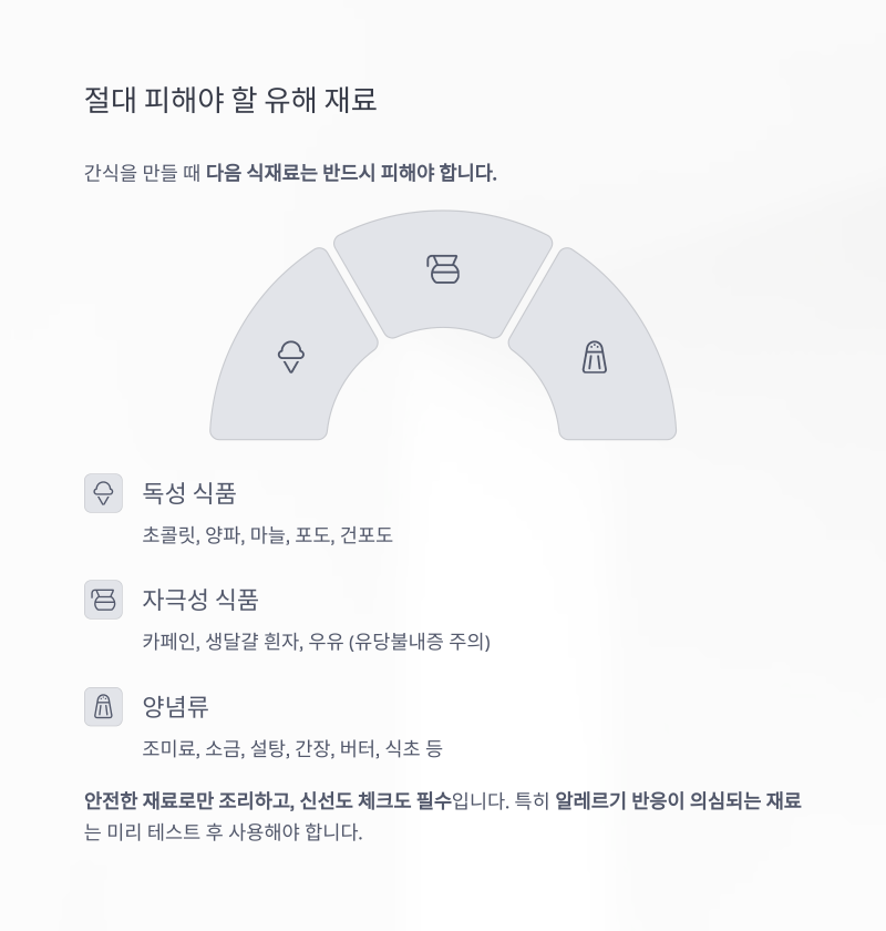 간식을 만들 때 다음 식재료는 반드시 피해야 합니다.