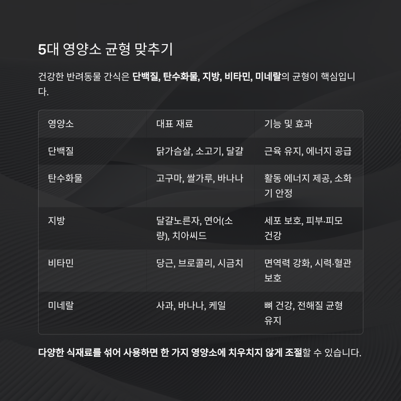 건강한 반려동물 간식은 단백질, 탄수화물, 지방, 비타민, 미네랄의 균형이 핵심입니다.