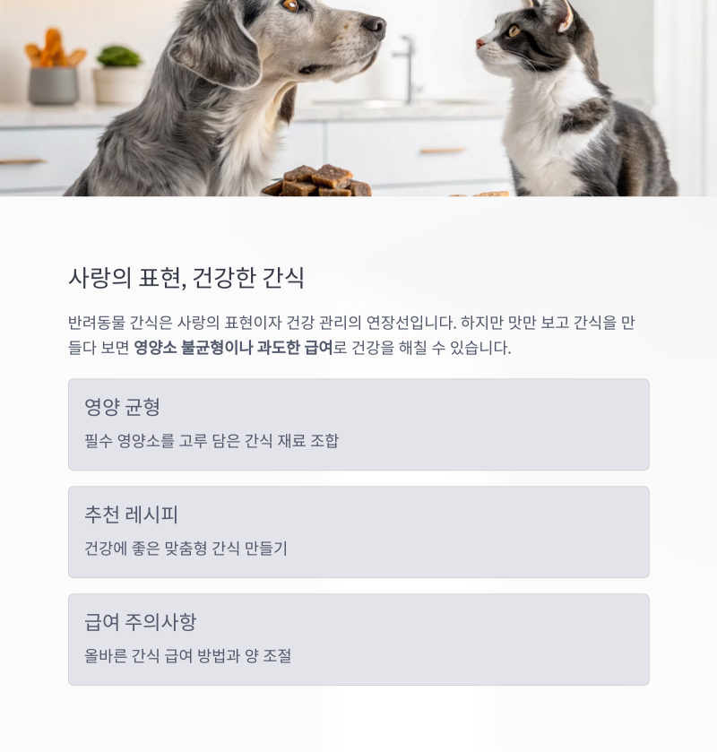 반려동물 간식은 사랑의 표현이자 건강 관리의 연장선입니다. 하지만 맛만 보고 간식을 만들다 보면 영양소 불균형이나 과도한 급여로 건강을 해칠 수 있습니다. 이 글에서는 필수 영양소를 고루 담은 간식 재료 조합과 추천 레시피, 그리고 급여 시 주의사항까지 꼼꼼히 안내합니다.