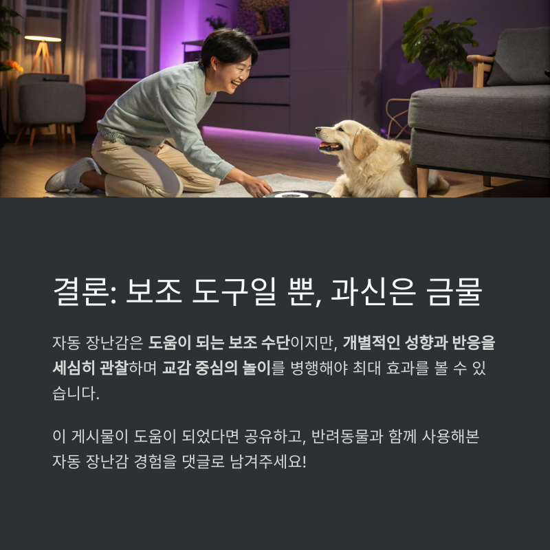 하지만 개별적인 성향과 반응을 세심히 관찰하며 적절한 사용법과 교감 중심의 놀이를 병행해야 최대 효과를 볼 수 있습니다.