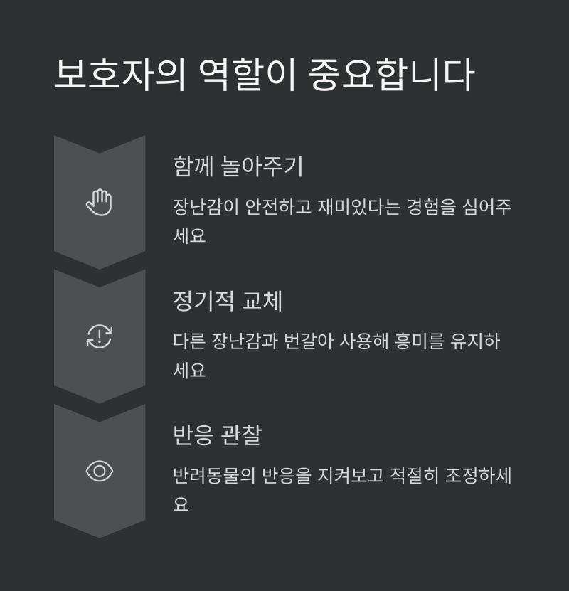 처음에는 보호자가 함께 놀아주며 "이 장난감은 안전하고 재미있다"는 경험을 심어주는 것이 중요합니다.