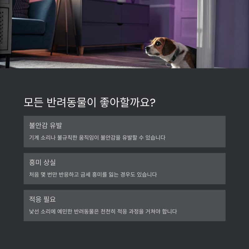 기계 소리나 불규칙한 움직임이 불안감을 유발하거나, 처음 몇 번만 반응하고 금세 흥미를 잃는 경우도 있습니다.