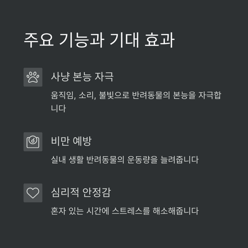 자동 장난감은 보호자의 부재 시 반려동물에게 자극을 주고 놀이 욕구를 채워주는 도구로 각광받고 있습니다.