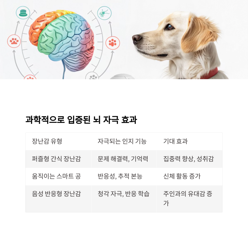 | 퍼즐형 간식 장난감 | 문제 해결력, 기억력 | 집중력 향상, 성취감 증가 |