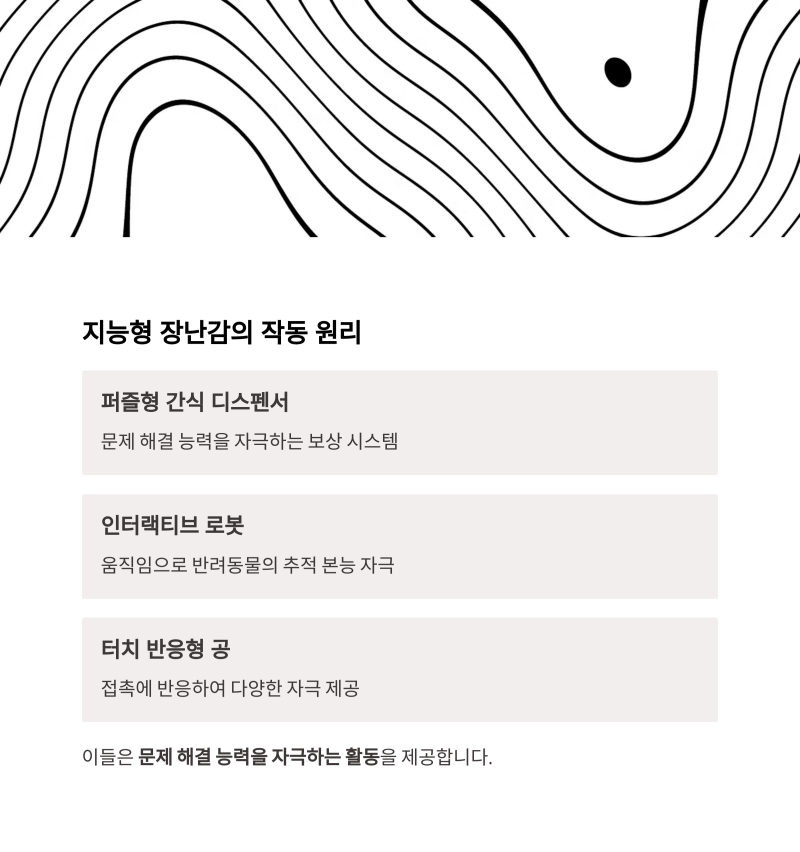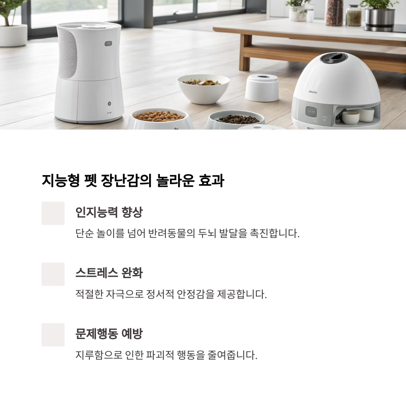 퍼즐, 센서, 자동화, AI 기능이 결합된 이 장난감들은 단순한 놀이를 넘어 반려동물의 인지능력 향상, 스트레스 완화, 문제행동 예방에 도움을 주는 것으로 알려져 있습니다.