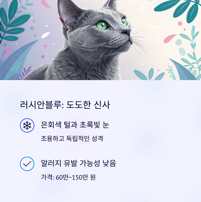 | 러시안블루 | 60만~150만 원 | 조용함, 알러지 유발 적음 |