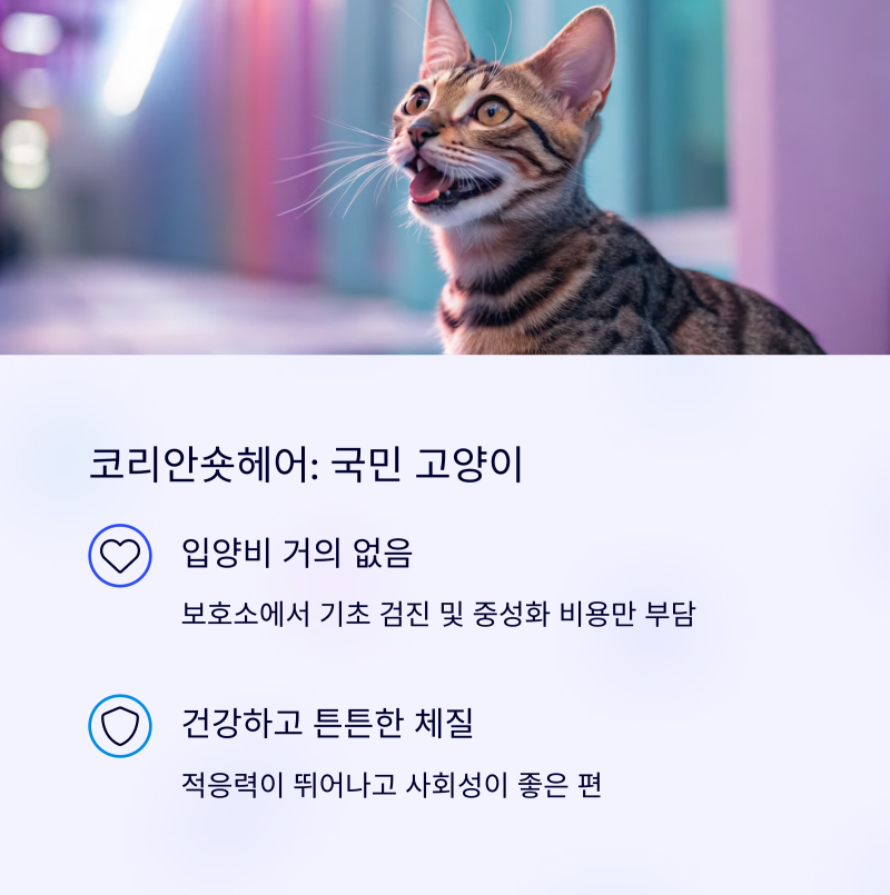 | 코리안숏헤어 | 무료~소정의 입양비 | 건강, 적응력, 저렴 |