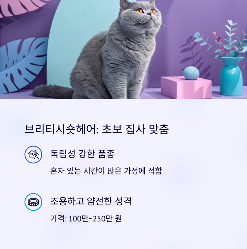 | 브리티시숏헤어 | 100만~250만 원 | 초보자용, 차분함 |