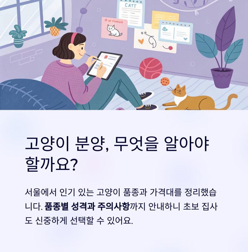 서울에서 고양이 분양을 고려하신다면, 품종별 특성과 분양가, 인기 이유를 꼼꼼히 살펴보는 것이 중요합니다. 품종묘부터 유기묘까지 가격과 성격, 관리 난이도까지 모두 비교해드립니다.