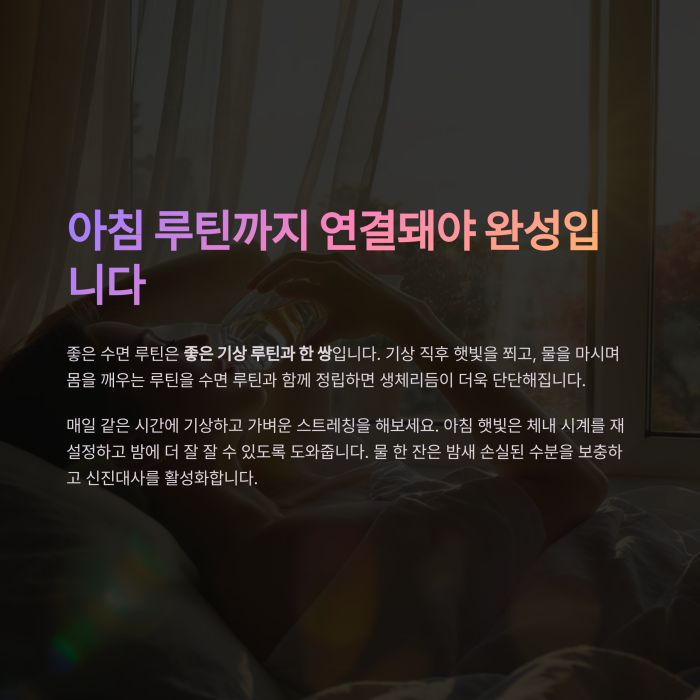 기상 직후 햇빛을 쬐고, 물을 마시며 몸을 깨우는 루틴을 수면 루틴과 함께 정립하면 생체리듬이 더욱 단단해집니다.