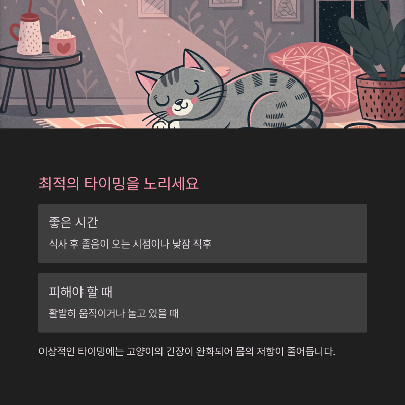 식사 후 졸음이 오는 시점이나 낮잠 직후가 가장 이상적인 타이밍입니다.