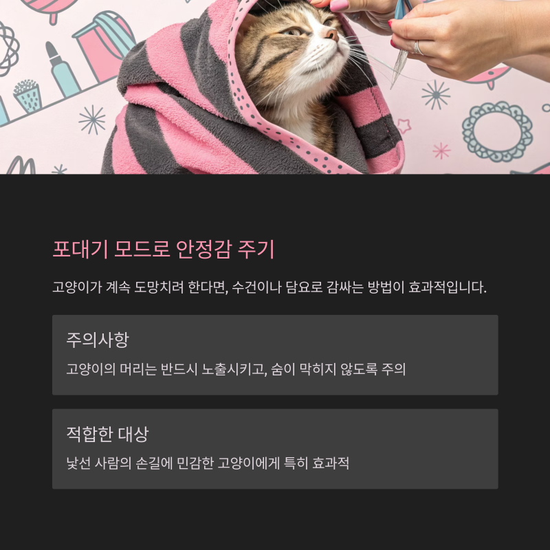 포대기 모드는 특히 낯선 사람의 손길에 민감한 고양이에게 적합한 방식입니다.